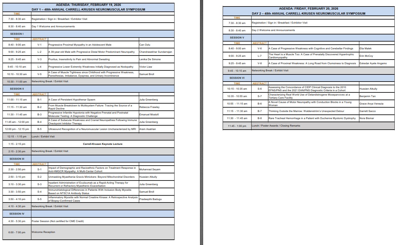 This symposium is a clinical education experience for members of multidisciplinary teams who care for patients with rare, complex neuromuscular diseases including hereditary muscular dystrophies, motor neuron diseases, neuroimmunologic neuropathies and rare genetic disorders of muscle and nerve. Case presentations will include physical diagnosis and discussion of management and new therapies by participating experts. All discussions involve active participation by attendees. The educational format for this activity includes didactic lectures with in depth Q&A, panel discussions, and PowerPoint Presentations. The content of the program is identified and developed through a Call for Abstracts process. The 2026 keynote speaker will present a formal lecture on the emerging landscape for metabolic myopathies.