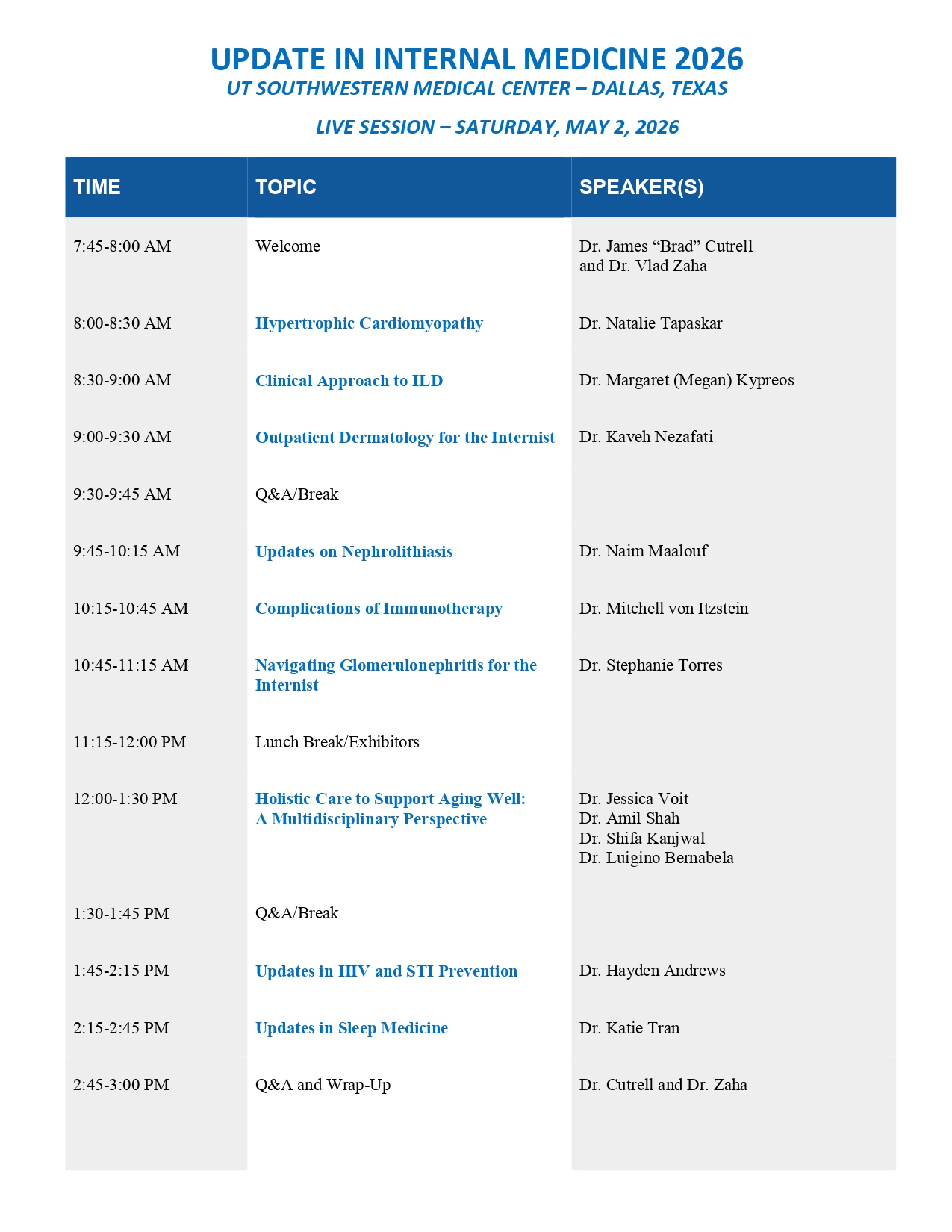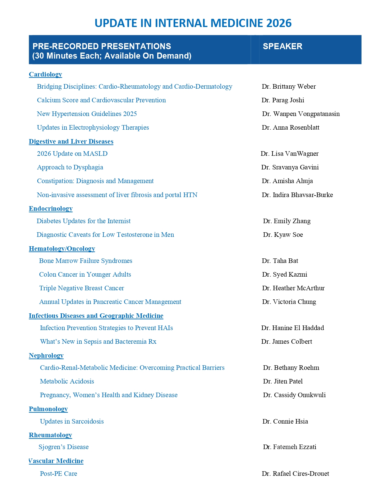 The diagnosis and treatment of diseases across the spectrum of internal medicine clinical practice continue to evolve rapidly, with new therapies and standards of care emerging across multiple disciplines. Clinicians who manage patients with varied diseases and comorbidities face ongoing challenges in maintaining current knowledge and integrating advances into clinical practice. The annual Update in Internal Medicine CME Conference is designed to address these challenges by supporting lifelong learning and practice improvement. The 2026 conference will include didactic lectures, panel discussions, and interactive Q&A sessions delivered as a blended learning activity, combining a one-day live, in-person program with pre-recorded, on-demand presentations. The overall goal of this activity is to provide primary care physicians and internists with evidence-based, practical information relevant to common clinical problems, consultation questions, and advances in translational medicine.